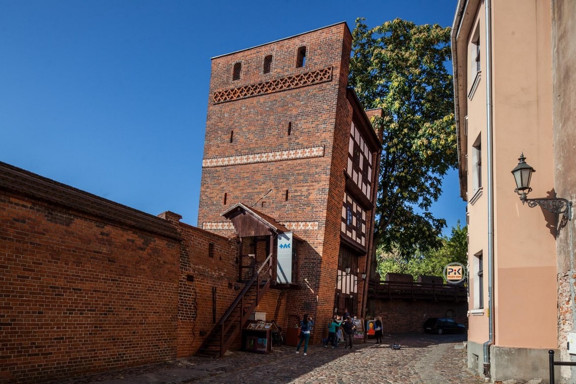 Toruń est une ancienne forteresse. Ses murs médiévaux comportaient 12 portes, plus de 60 donjons et deux barbacanes. Le donjon le plus célèbre est la tour penchée. Cette tour carrée du 13e s. fut convertie en prison en XVIIIe s. avant de devenir une maison d’habitation. Même si son aspect penché est dû à un affaissement de terrain, plusieurs légendes évoquent d’autres raisons expliquant cette forme bizarre : une des légendes dit que le penchant de la tour est une punition infligée aux chevaliers teutoniques pour leurs péchés. Une autre raconte que c’était une punition pour la ville qui vit naître Copernic, l’astronome aux théories hérétiques. On a là l’occasion de faire une preuve de sa conscience tranquille. Il suffit de se tenir sous la tour avec des talons, le dos et la tête contre le mur, les bras tendus devant. Celui qui réussit cette épreuve sans tomber montre qu’il est vertueux…